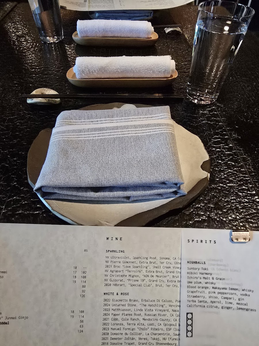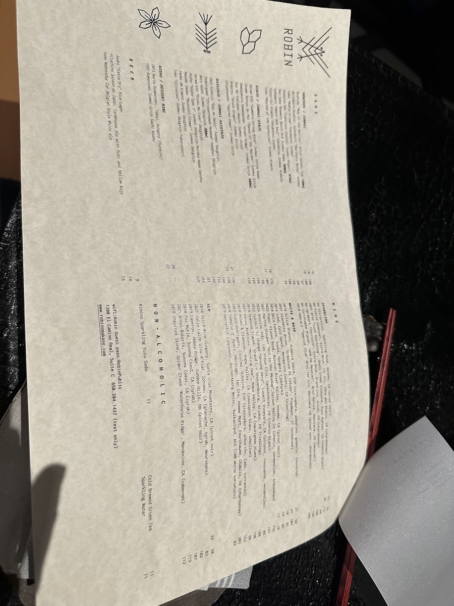 SASHIMI: TORO - wasabi, chives. KANPACHI - citrus, yuzu gel, shiso. ALBACORE - crispy shallots, opal basil, sesame seeds, black lime. ROLLS: SPICY SALMON - cucumber, shallots. TUNA - morel soy, charred shishito. SESAME NOODLES - Japanese chimichurri, black truffle. UNI Rice or TORO Rice.